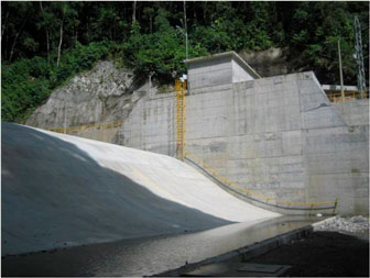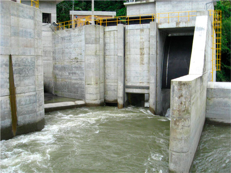 - Presa Vertedero: Estructura en concreto hidráulico, con una altura aproximada de 7 m, un ancho en su base de 25 m y una longitud de 37.2 m. La cresta de la gola se localiza en la elevación de 584 msnm, con muros laterales y un deflector disipador al final de la estructura, para entregar el caudal nuevamente al río Guarinó, a la cota 576.80 msnm.